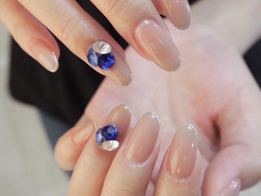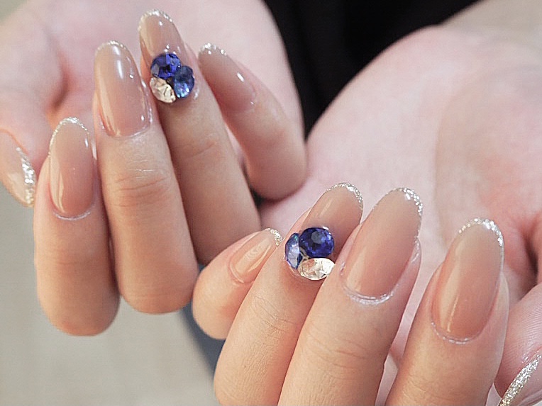 | ブルー☆ビジュー | ベージュカラーに先端シルバーラメで上品なシンプルデザインです♪ ポイントのブルーが目立って素敵です☆ブライダルネイルにもおすすめです♡ |